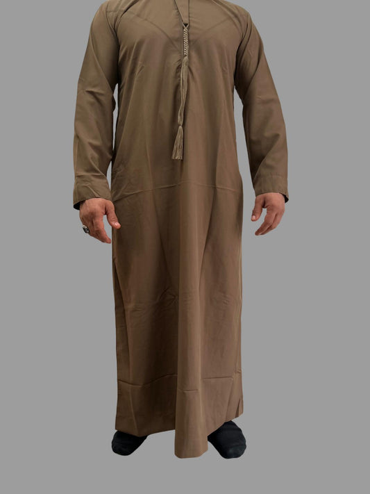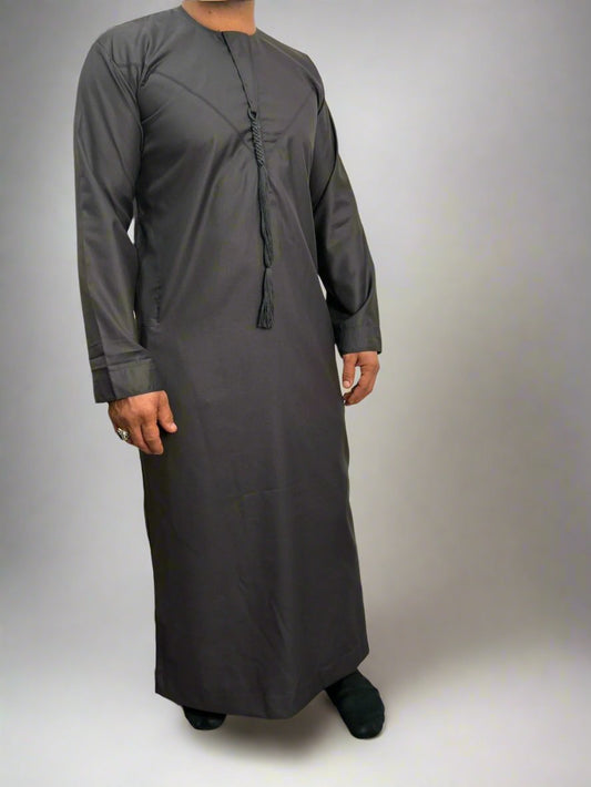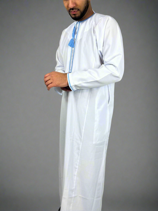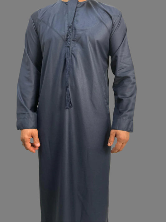Men’s Omani Thobes: Another collarless design, our men’s Omani thobes feature a shorter loose tassel above the right breast and come with premium options, including understated decorative embroidery. Like all of our thobe designs, our Omani thobes are made from superior spun polyester with a practical anti-static finish and are available in either standard or slim fit.