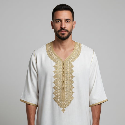 Men’s Moroccan Thobe/Gandoura: Combining tradition and comfort, our premium spun polyester gandouras for men offer elegance in simplicity. With delicate embroidery and a unique hooded design, they're versatile for any occasion. Experience style and functionality effortlessly with our Moroccan gandouras.
