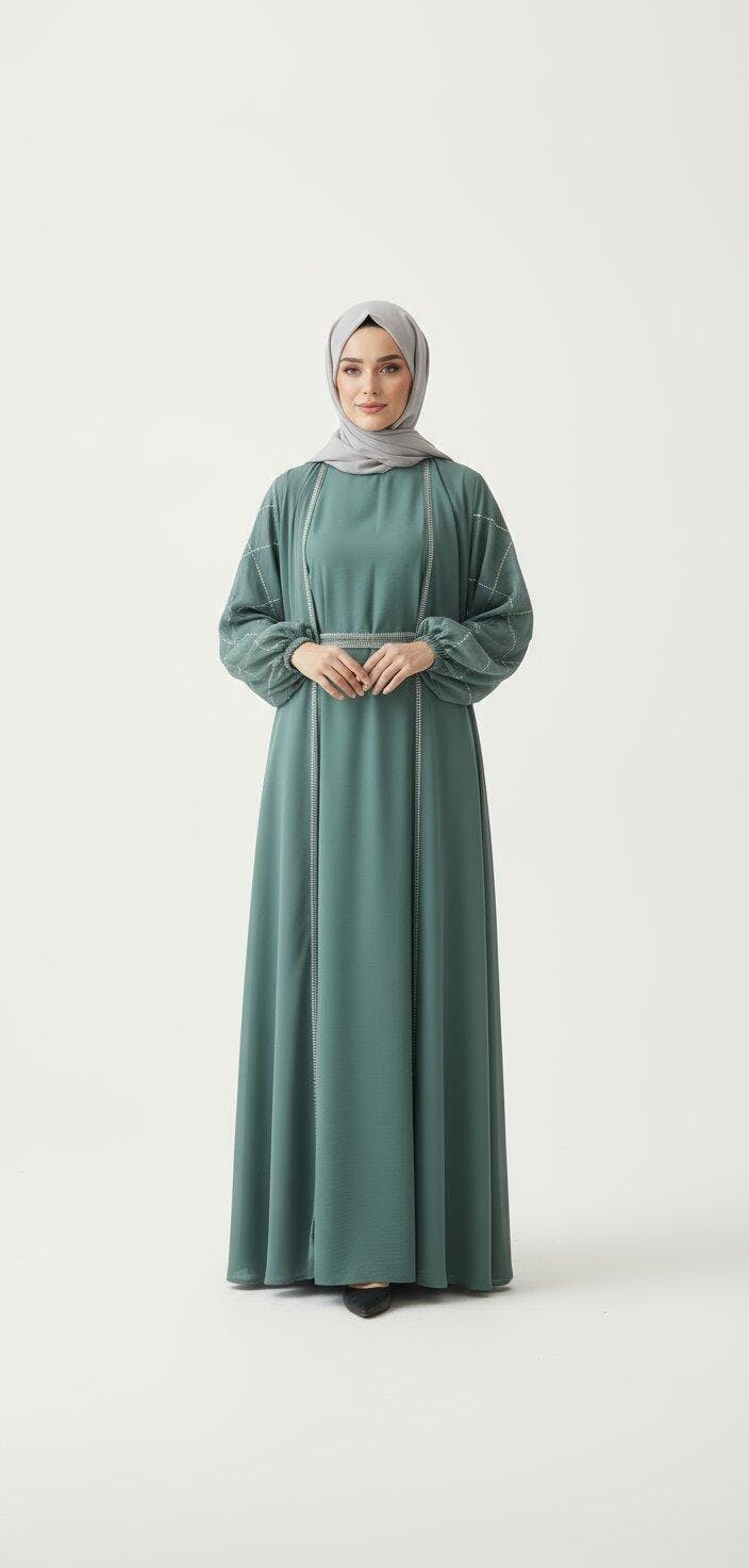 Embrace sophisticated style with this beautifully crafted abaya in a calming sage green hue. This versatile piece effortlessly combines modern design with traditional modesty, making it perfect for any occasion.